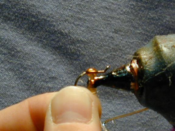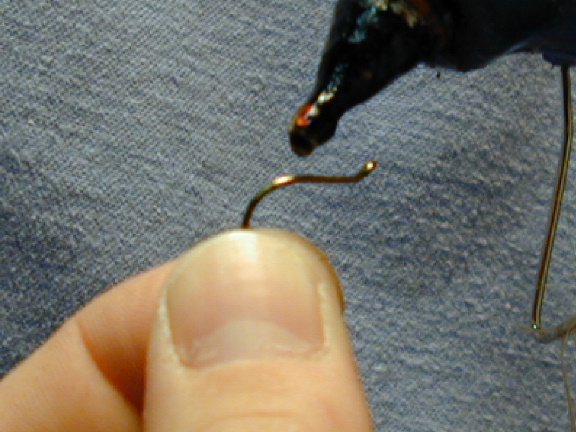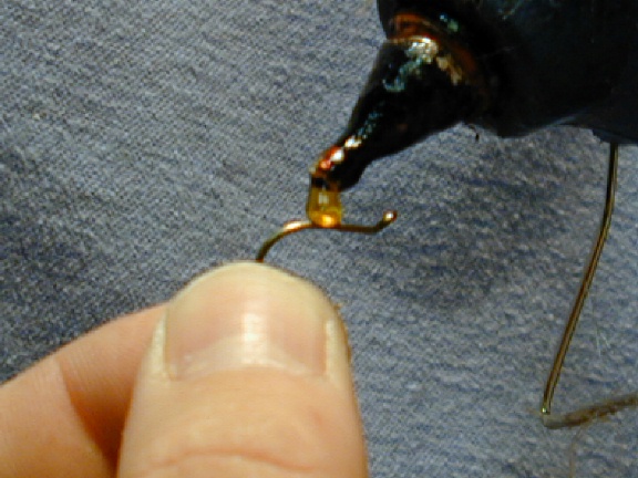 over the bead chain eyes and... Remember: I hold the hook in my hands so I can rotate the Moe Blank as soon as the nozzle is away from the blank. The glue sags quickly and instantly turning, twisting is needed. Most of the time it takes about 5 sec. to shape the blank by twisting into shape. |