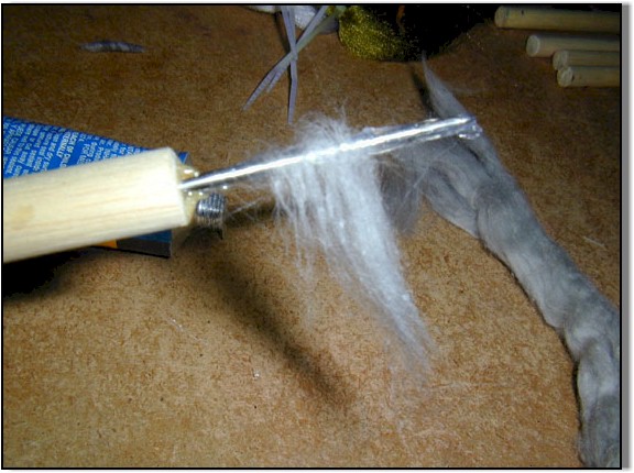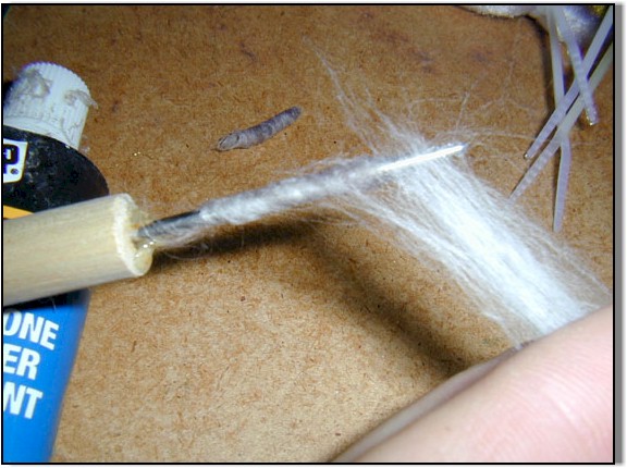 Put a piece of 12 plus fibers of Water Silk (or other equivalent material) on work area surface and touch with silicone coated needle as in Mayfly Tail add-on.