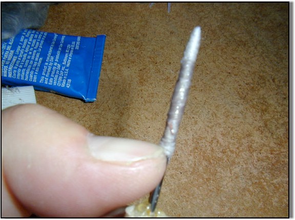 Squeeze some silicone of your finger to put an overcoat of silicone over dubbing. Spin needle as you coat body with silicone on finger.