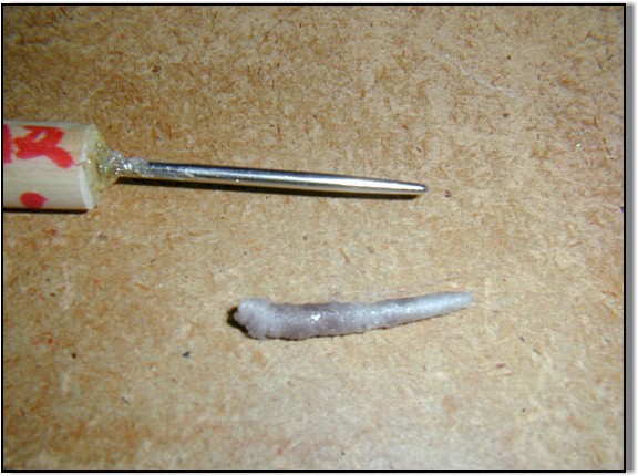 Once body is to desired shape and size, take your thumbnail and put behind base of body and push off of needle. Place body on paper towel and let dry.